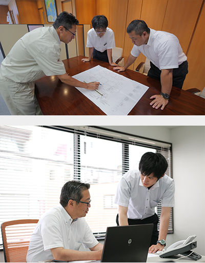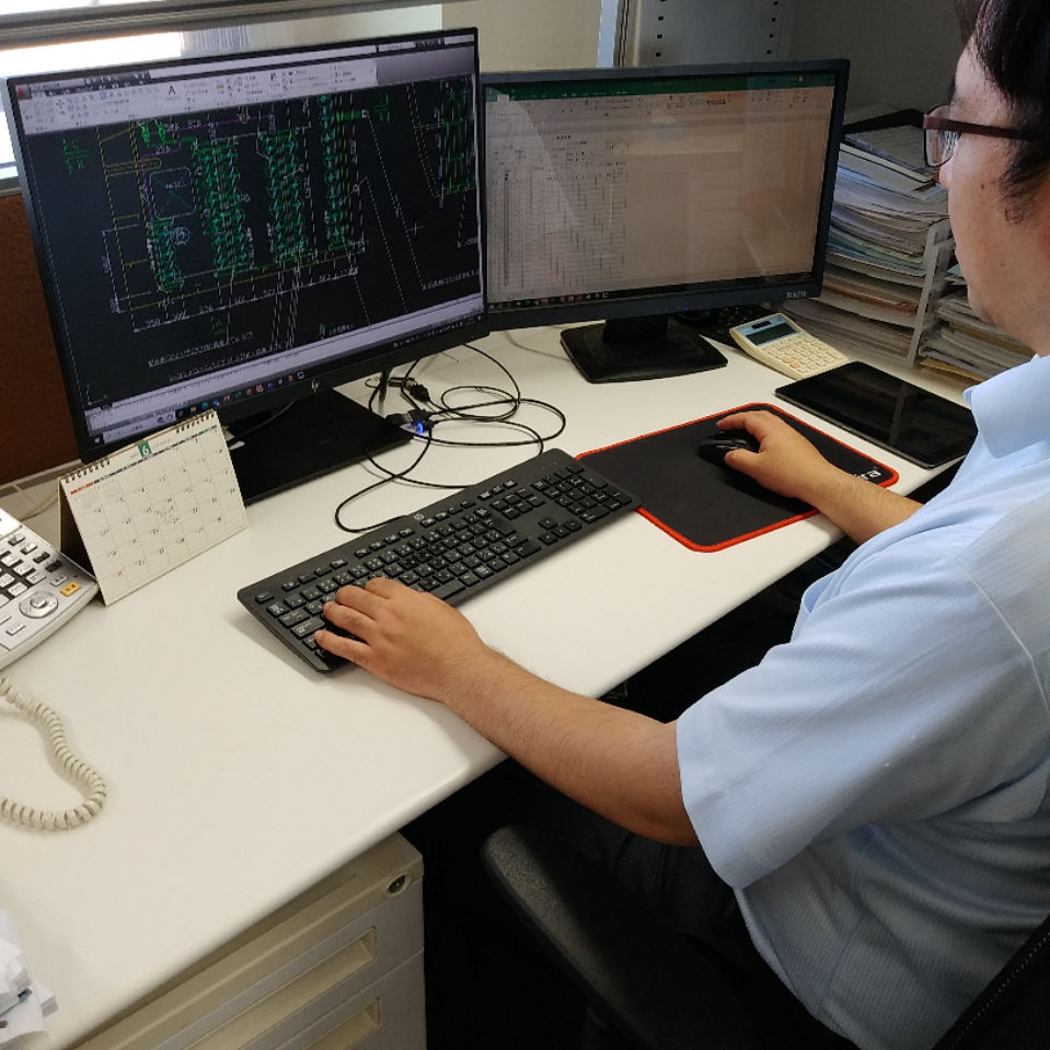 弊社取扱い商品の設計業務としてCADを用いた、各種消火装置、計測機器等の図面作成、造船所殿設計担当者及びメーカーとの打ち合わせ作業、製作図面の管理、自社製品の検査サポート等があります。